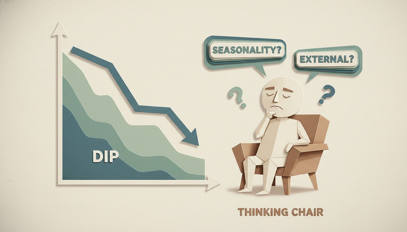 売上やアクセス数などの数値が下がった瞬間、「何か手を打たなければ」と焦ってしまいがちです。しかし、感情のままに動くと、原因を取り違えたり、短期的な揺らぎに過剰反応してしまう危険があります。この記事では、数値が下がった時の考え方の整理手順を通じて、落ち着いて状況を見極めるための視点をまとめます。